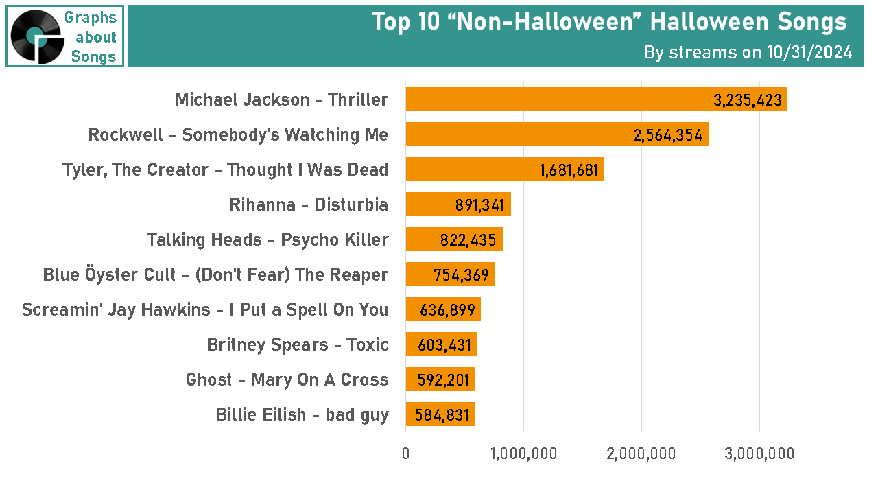 Rihanna’s “Disturbia” and Britney Spears’ “Toxic” also surge in streaming on Halloween.