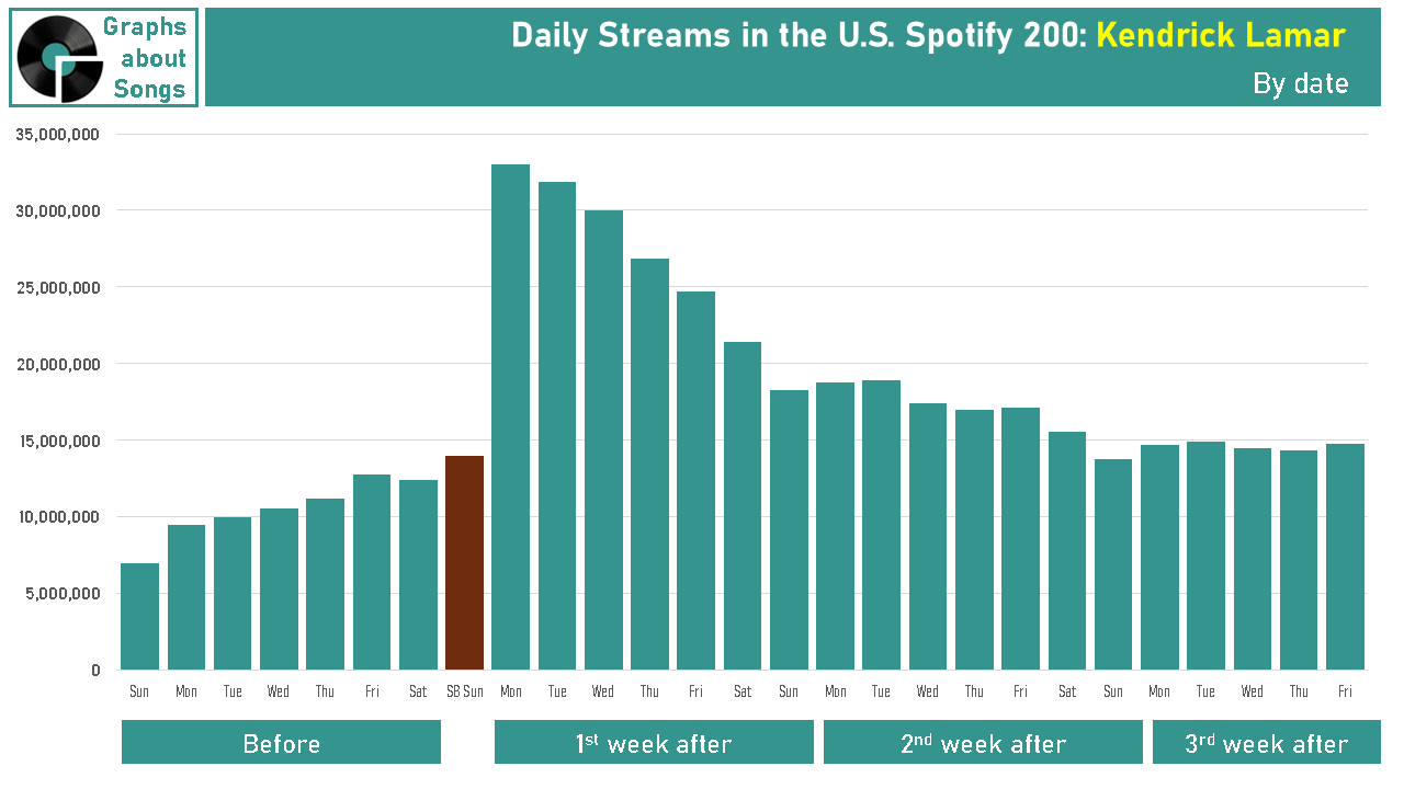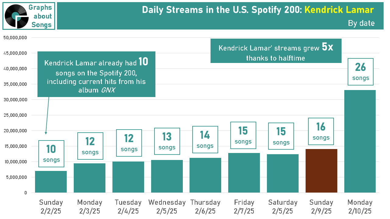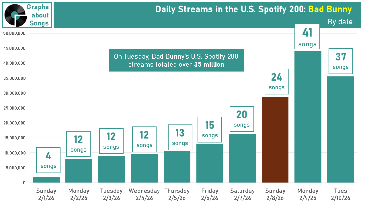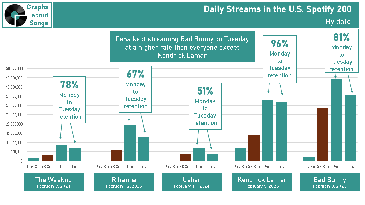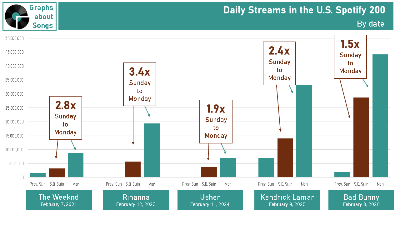 Kendrick Lamar won on Monday: On Super Monday, Kendrick Lamar’s U.S. Spotify 200 streams jumped from 14 million to 33 million, over 2.4 times as many plays as he received on game day. Bad Bunny’s streaming had already grown to almost 29 million Spotify streams on Sunday (over twice as many as Lamar received the day of his halftime show). On Monday, U.S. Spotify users played Bad Bunny songs over 44 million times. That’s a record, beating Kendrick Lamar’s Super Monday streams by 33-percent. It is, however, a Sunday to Monday jump of only 1.5 times compared to Lamar’s 2.4x jump.