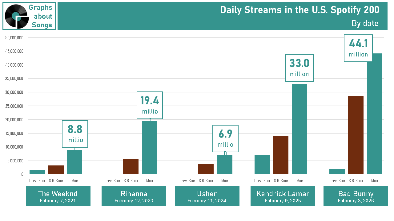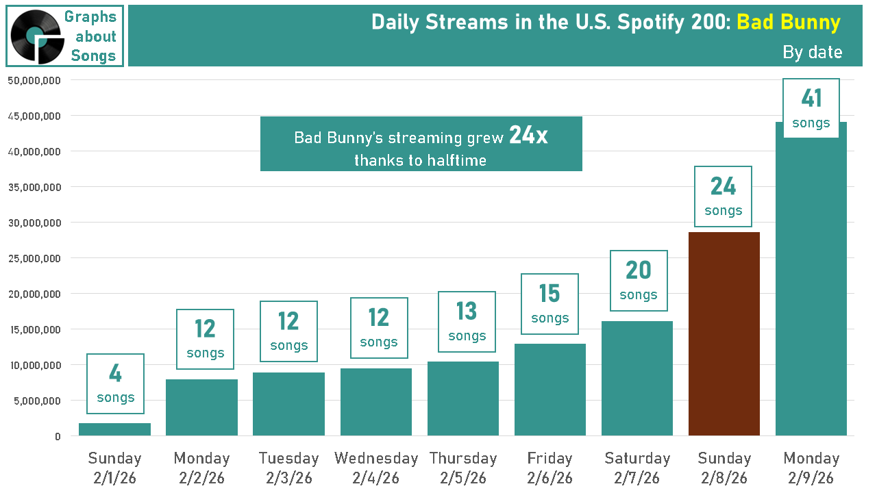Last year, I spotlighted how Kendrick Lamar’s halftime performance, despite your Uncle Dave’s opinion on X, was a huge hit. How did Bad Bunny’s music consumption compare?