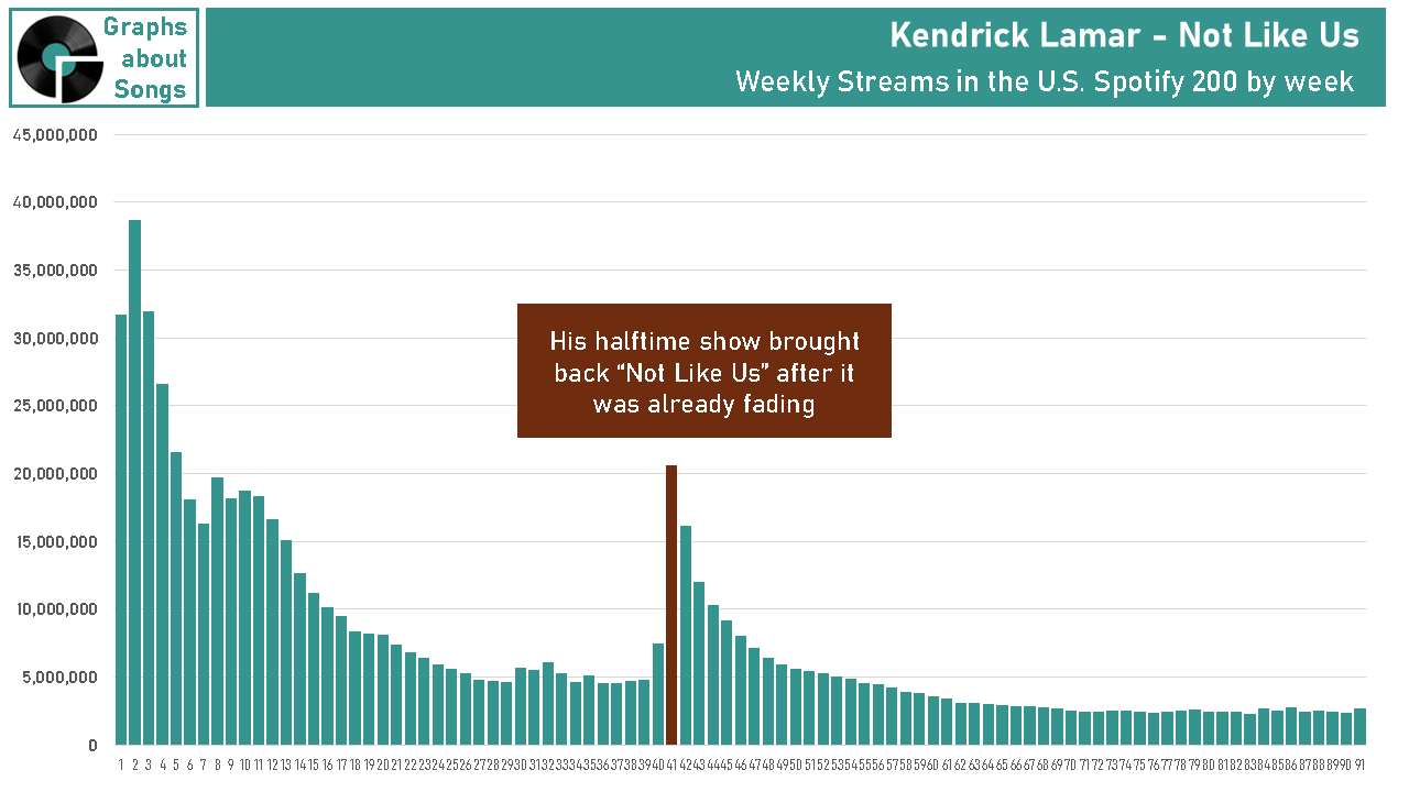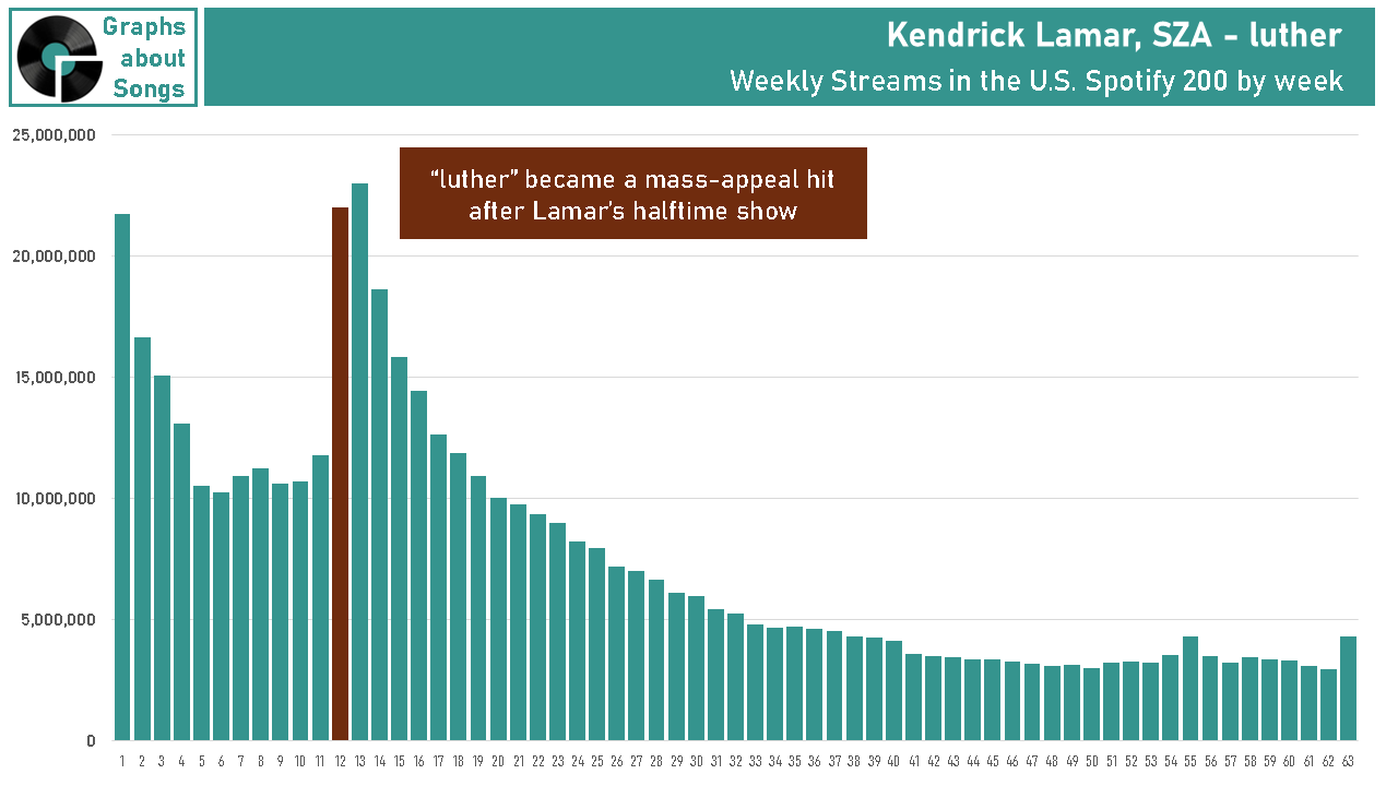 Kendrick Lamar sustained greater streaming levels for weeks after his halftime performance. Not only did “Not Like Us” receive renewed interest after it is already fading among its core fans, “luther” went from being an album cut to a Top 40 radio smash.