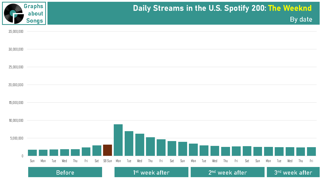 The Weeknd (2021) – “Blinding Lights” was still a Top 10 hit on the Billboard Hot 100 and in the Spotify 200, while “Save Your Tears” was also already Top 10 on Spotify heading into gameday. His daily streaming only grew about five times from the previous Sunday to Super Monday, with just under nine million Spotify plays for the day.