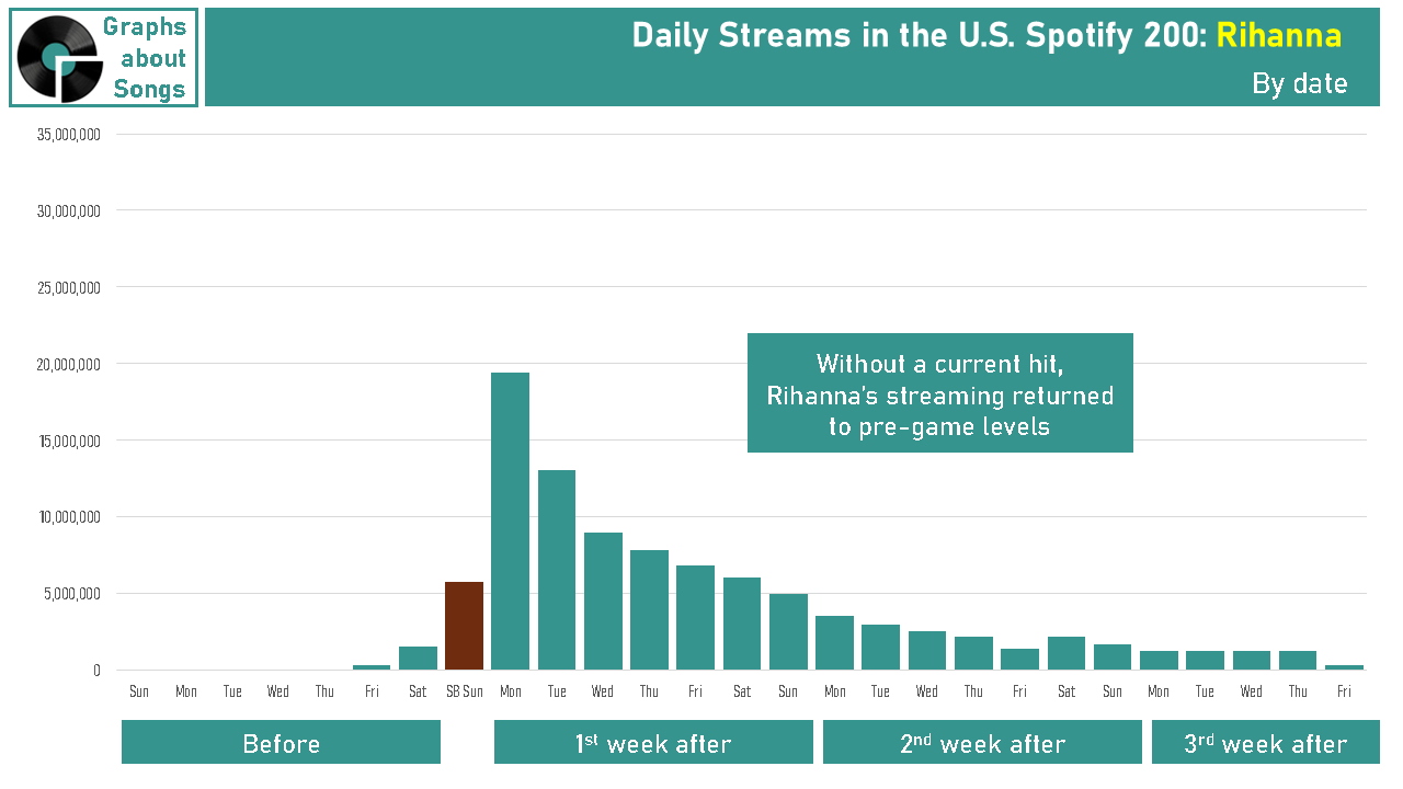 Rihanna, without a current hit, saw streaming levels drop over the next few weeks quicker than other halftime stars. Her performance did return her 2016 hit “Needed Me” to the Spotify 200 for a month.