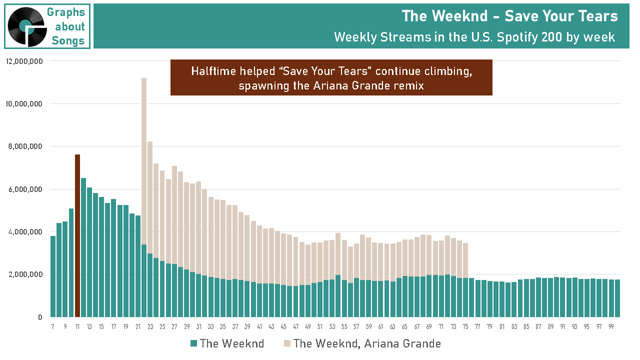 The Weeknd didn’t sustain much interest in past hits, but his halftime show did help “Save Your Tears” keep climbing, ultimately spawning the remix version with Ariana Grande.