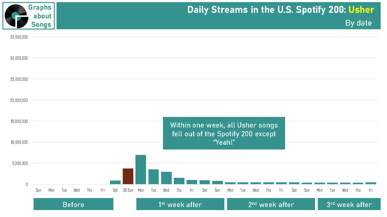 Usher, whose hits had ended a dozen years ago, benefited the least from his appearance. Within a week, all of his songs had fallen out of the Spotify 200 except his signature 2004 hit “Yeah!” with Lil Jon and Ludacris. Even “Yeah!” fell out of the Spotify 200 by the end of March but returns from time to time when we collectively need a pick-me-up from Usher’s shawty-related club dilemmas.