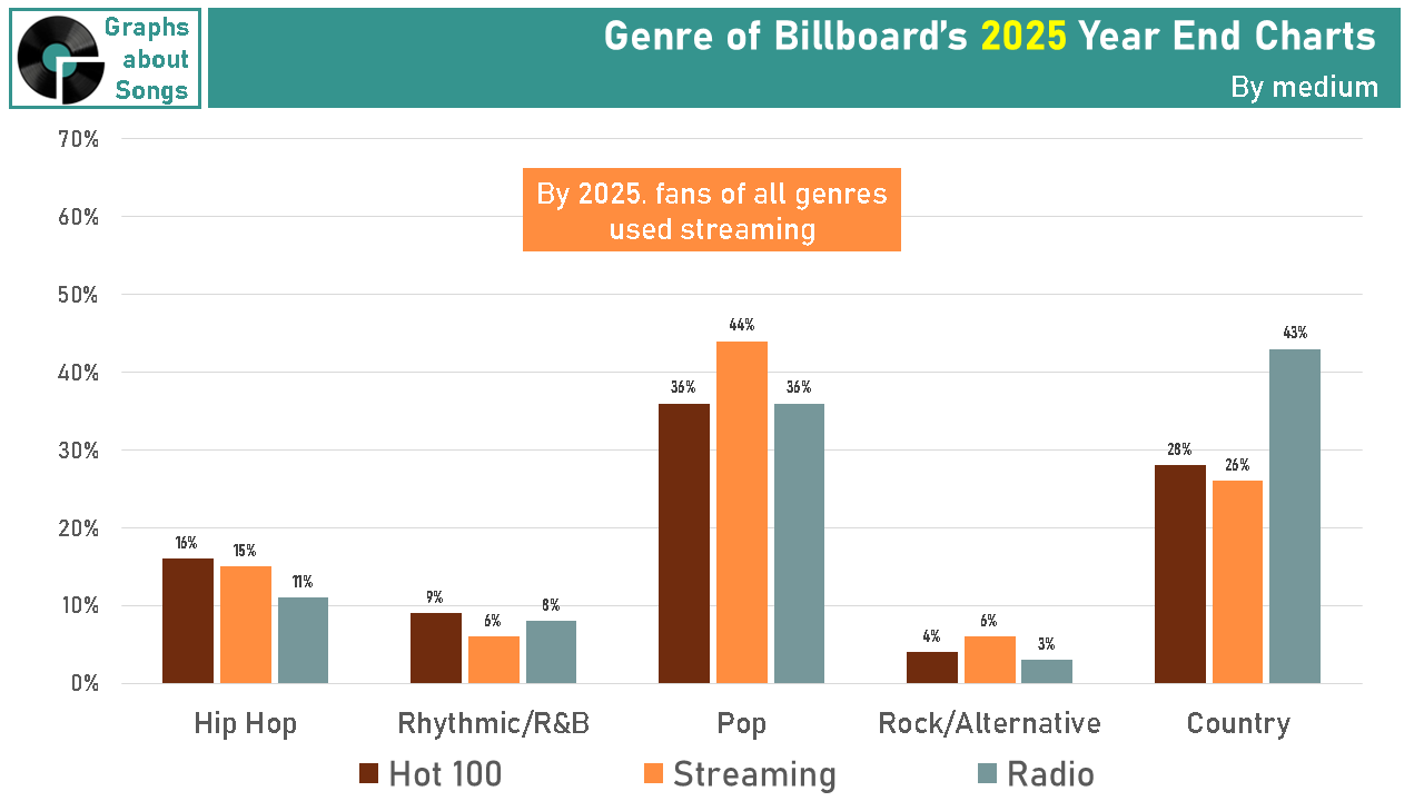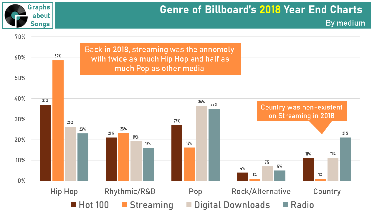 When Hip hop fans used Spotify, Pop fans bought iTunes, and Country fans relied on radio, comparing genre popularity was tricky, even for Billboard. Why can we finally make fair comparisons again?