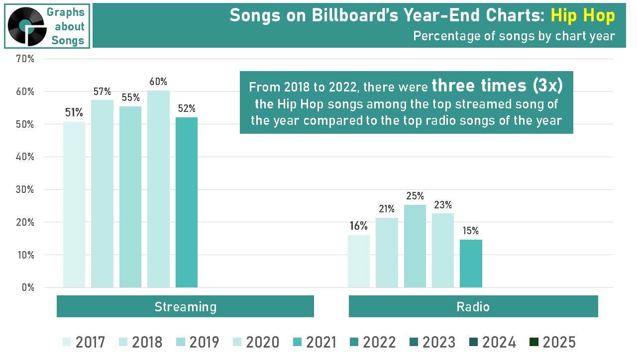 Not according to radio programmers: The percentage of Hip Hop among radio’s most played songs of 2022 actually increased slightly. Since 2022, radio and streaming have fairly comparable percentages of Hip Hop titles among the year’s biggest.
