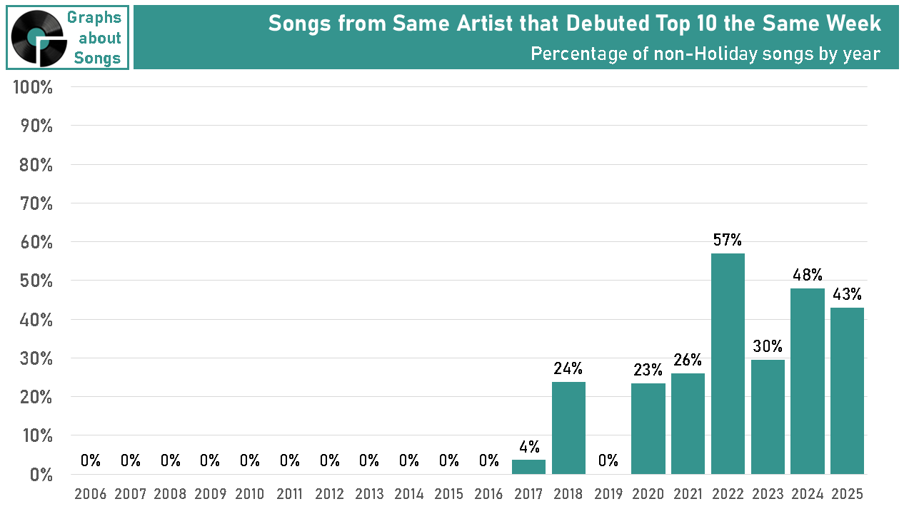 3)) Around 2018, artists begin debuting multiple songs simultaneously in the Hot 100’s Top 10.