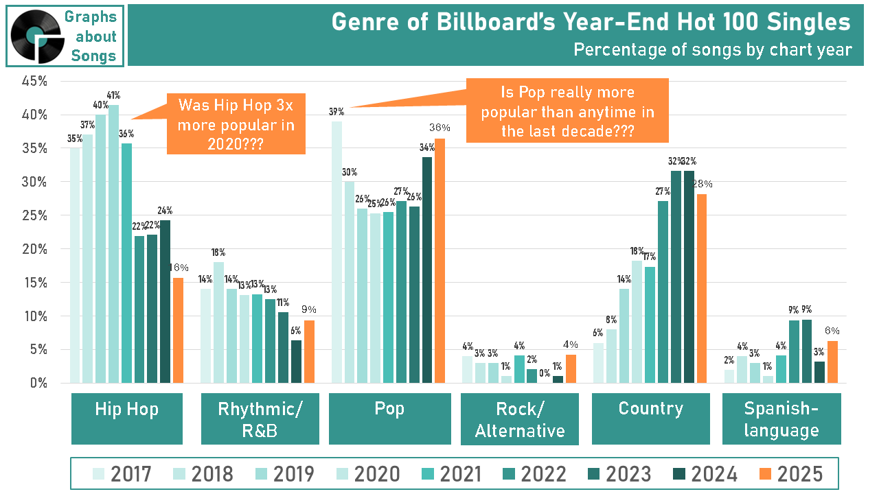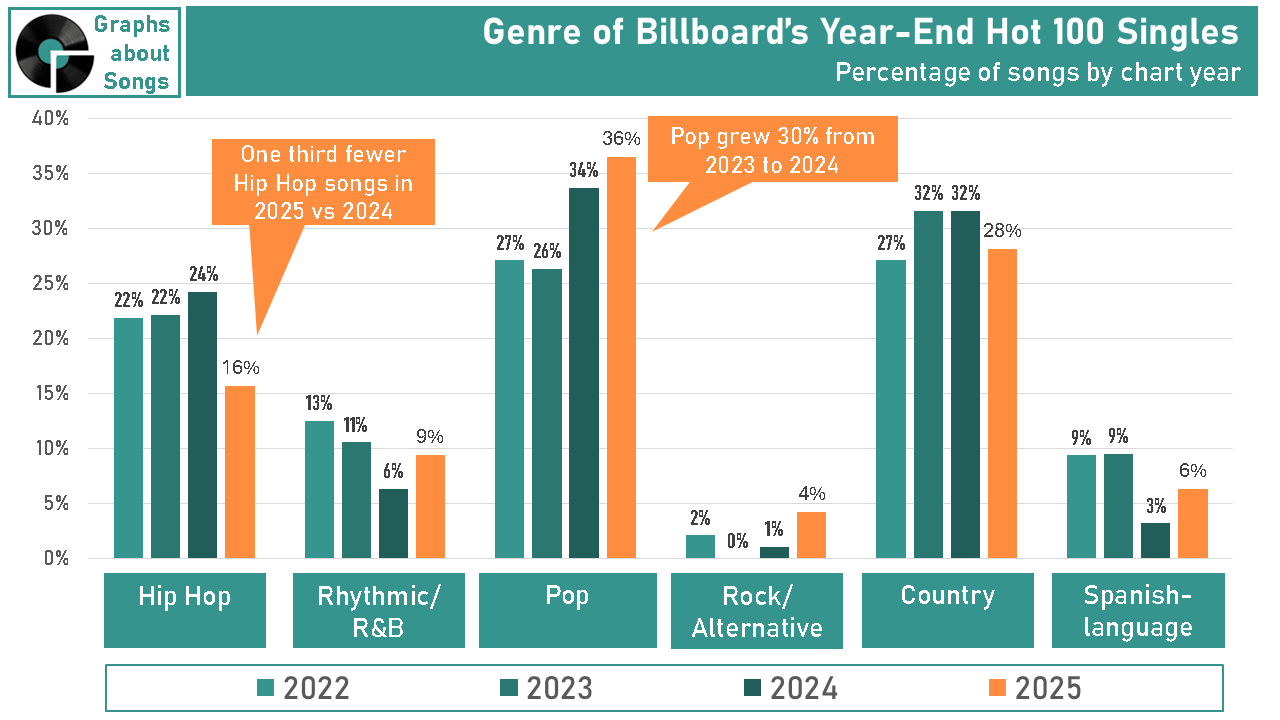 Coupled with no Hip Hop releases in 2025 that could match Kendrick Lamar’s GNX last year, Hip Hop simply had fewer songs among the year’s biggest hits than the genre scored last year.