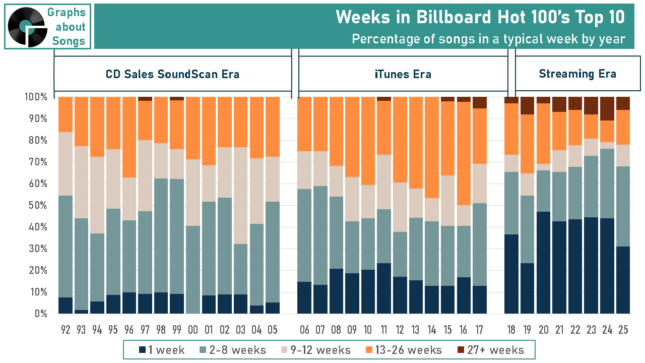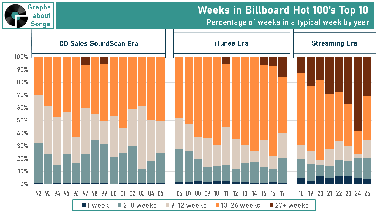 2) Starting around 2018, a new crop of megahits emerged that stay in the Top 10 for well over 26 weeks. That’s another phenomenon only possible because streaming shows us how long fans keep playing a song, not just the moment they buy it. (I showcased this issue in “Do You Have to Let it linger?”)