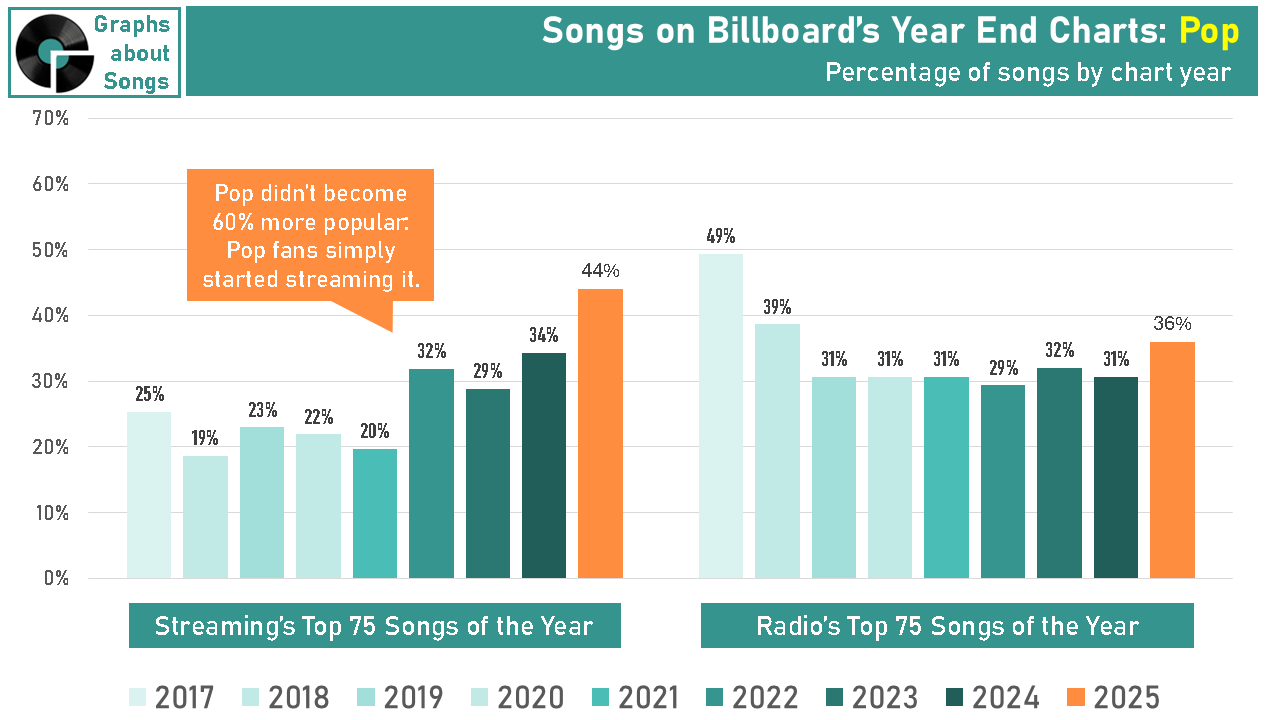 From 2018 through 2021, only one in five of the most-streamed songs each year were pure Pop titles. Then in 2022, that number jumped to an average of 35% each year from 2022 through 2025. As with Hip Hop, Pop didn’t suddenly become more popular: On Billboard’s charts of the most played songs on the radio each year, Pop barely budged from about a third of all songs.