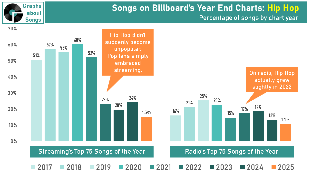 Toi truly judge Hip Hop’s appeal in 2025, we need to compare it only to those years when streaming’s audience included all genre fans—and therefore—Billboard’s Hot 100 isn’t reflecting Hip Hop’s fans with streaming metrics and everybody else’s consumption based on sales and radio airplay.