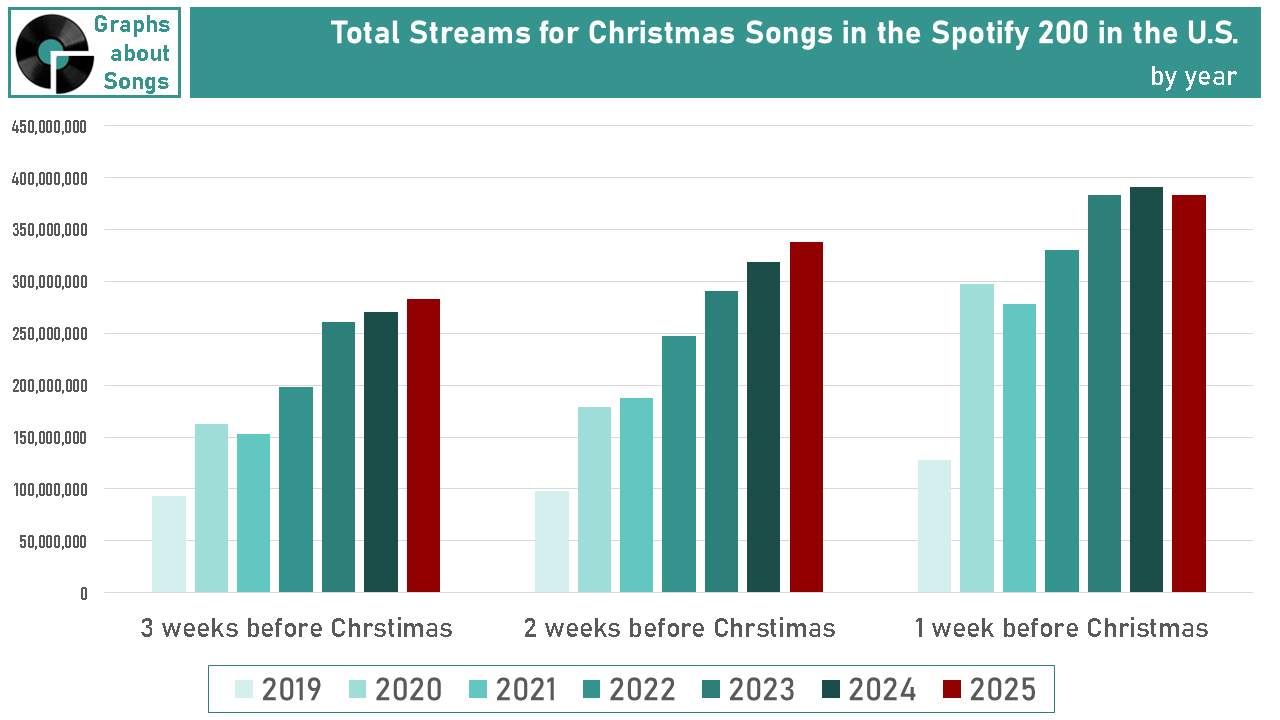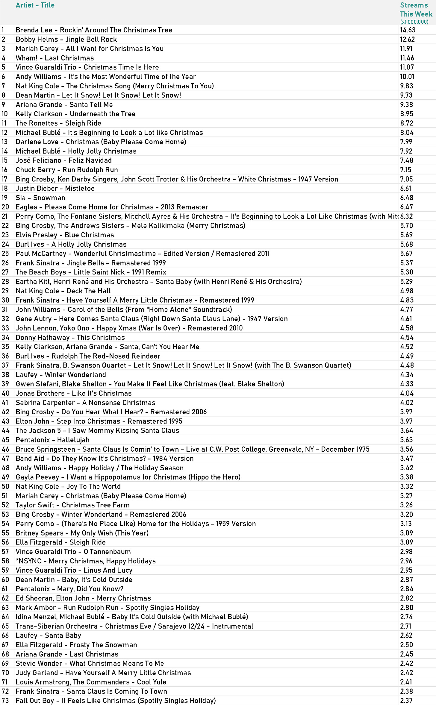 For the week ending last Thursday—exactly one week before Christmas—73 of the 200 most-played songs on Spotify in the U.S. are Christmas songs. (There’s one brand new Christmas song way at the bottom of this list—by an artist you won’t find on a Christmas CD at Kohls.)
