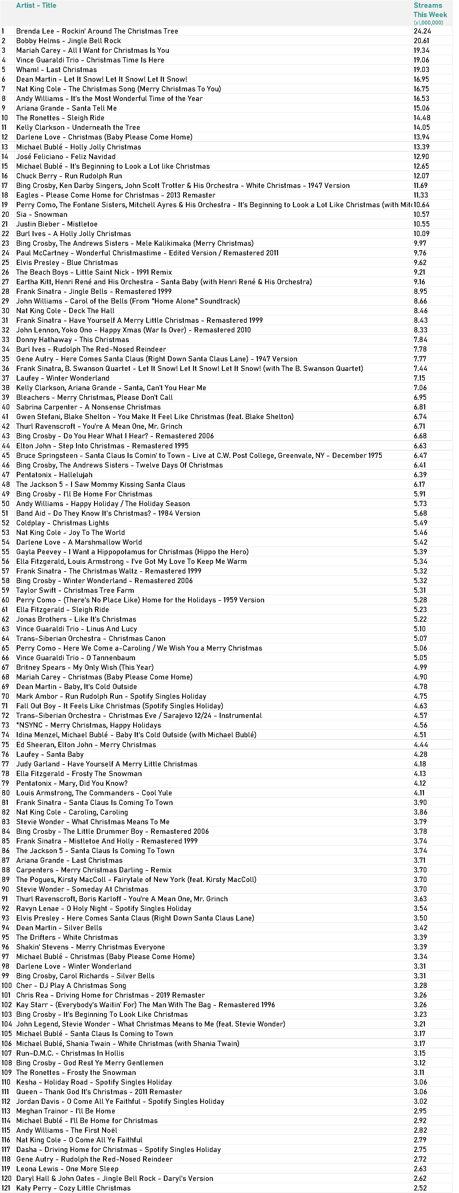 With this help from the calendar, Christmas week recorded a record 121 holiday songs on the Spotify 200, totaling a record 821 million plays. Seventy-Eight percent (78%) of all streams on the Spotify 200 this past week were Christmas songs.