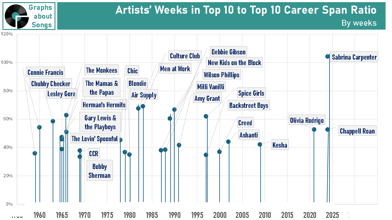 Next, I noted the total number of weeks that artist’s hits spent in the Top 10 and compared it to the weeks of their career span. That gives us a ratio, expressed as a percentage, to judge how popular that artists’ songs were during their Top 10 run. The artists are ranked on this ratio.