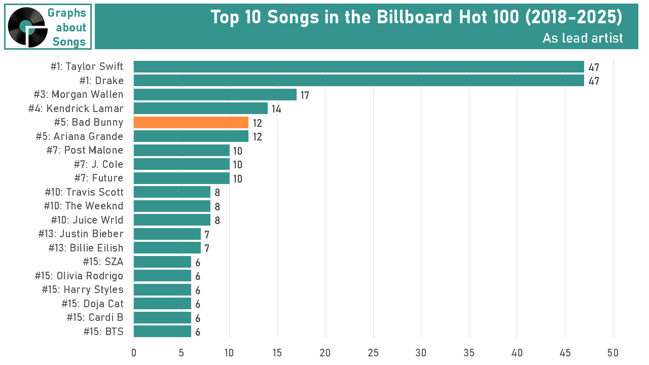 Granted, Bad Bunny’s hits do not tend to stay in the Top 10 for as long as some artists. Cumulatively, Bad Bunny has spent 33 weeks in the Hot 100’s Top 10 as lead artist. That pales compared to Drake, Post Malone, and Taylor Swift, but it’s still more weeks than Justin Bieber, Luke Combs, Chappell Roan, Beyoncé, or Adele have spent in the Top 10 from 2018 through today.