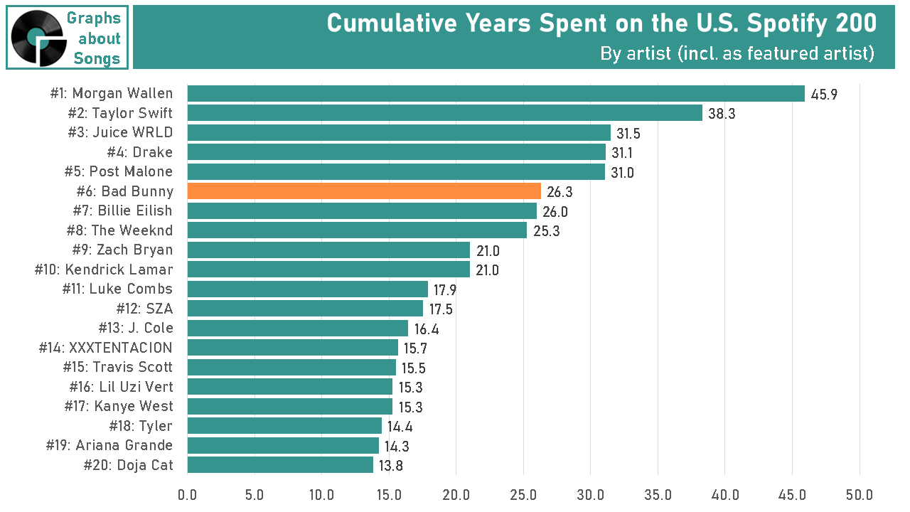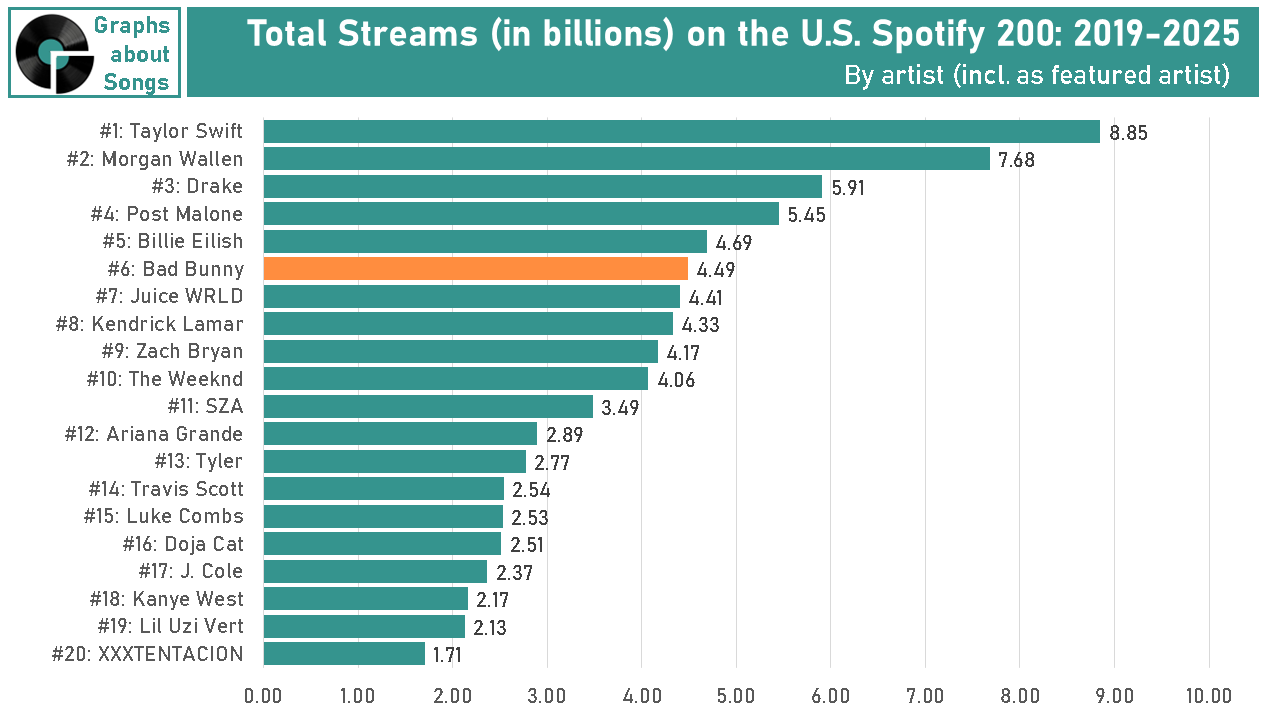 Only Taylor Swift, Morgan Wallen, Drake, Post Malone, and Billie Eilish have more total Spotify 200 streams than Bad Bunny has.