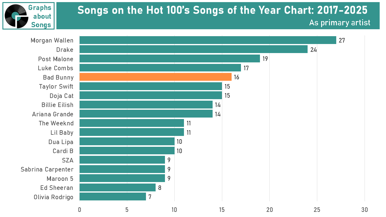 It’s 21 songs on the year-end Hot 100 charts if you also include songs featuring Bad Bunny.