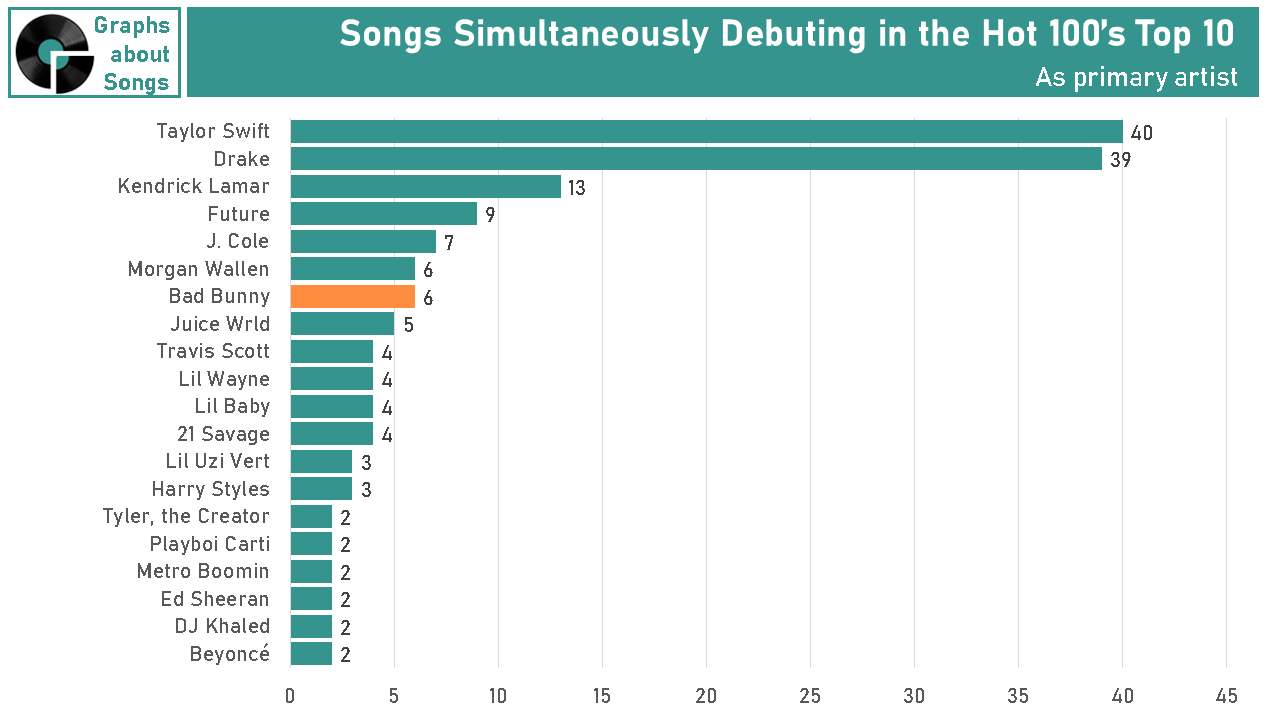 #5 Bad Bunny is one of only 20 artists to ever simultaneously debut multiple tracks in the Hot 100’s Top 10.