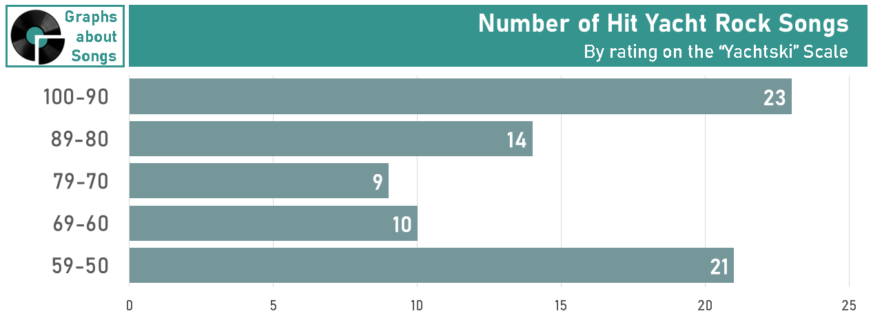 Meanwhile at the stern are those Yacht Rock songs that barely made it on board. There are almost as many bona-fide hits that are barely Yacht Rock, with a Yachtski Score between 50 and 60, than there are songs that are “essential Yacht Rock”