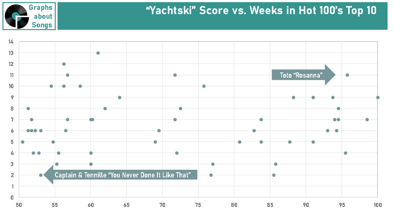 Toto’s Rosanna is on the far upper right because its the combination of the most Yachty and the most weeks in the Top 10. (Very Yacht + Big Hit)