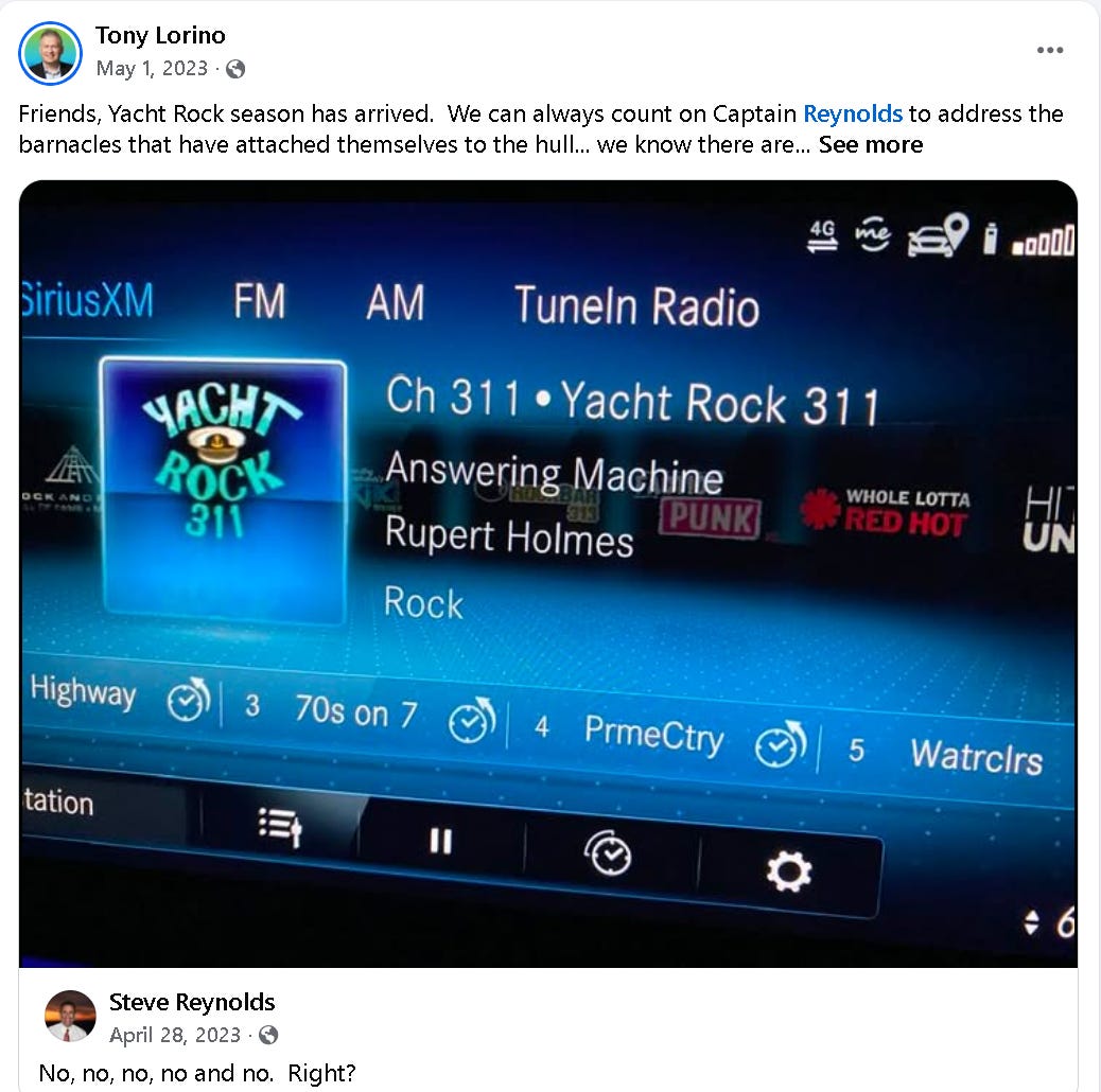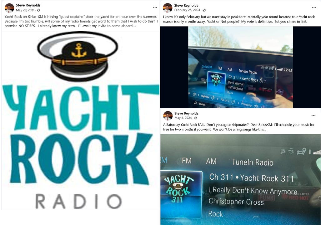 Professionally, Steve Reynolds is a talent coach for morning radio personalities. On Facebook, however, he’s known for his barbed accusations against Sirius/XM’s Yacht Rock Radio for playing songs that either aren’t Yacht Rock or aren’t familiar hits.
