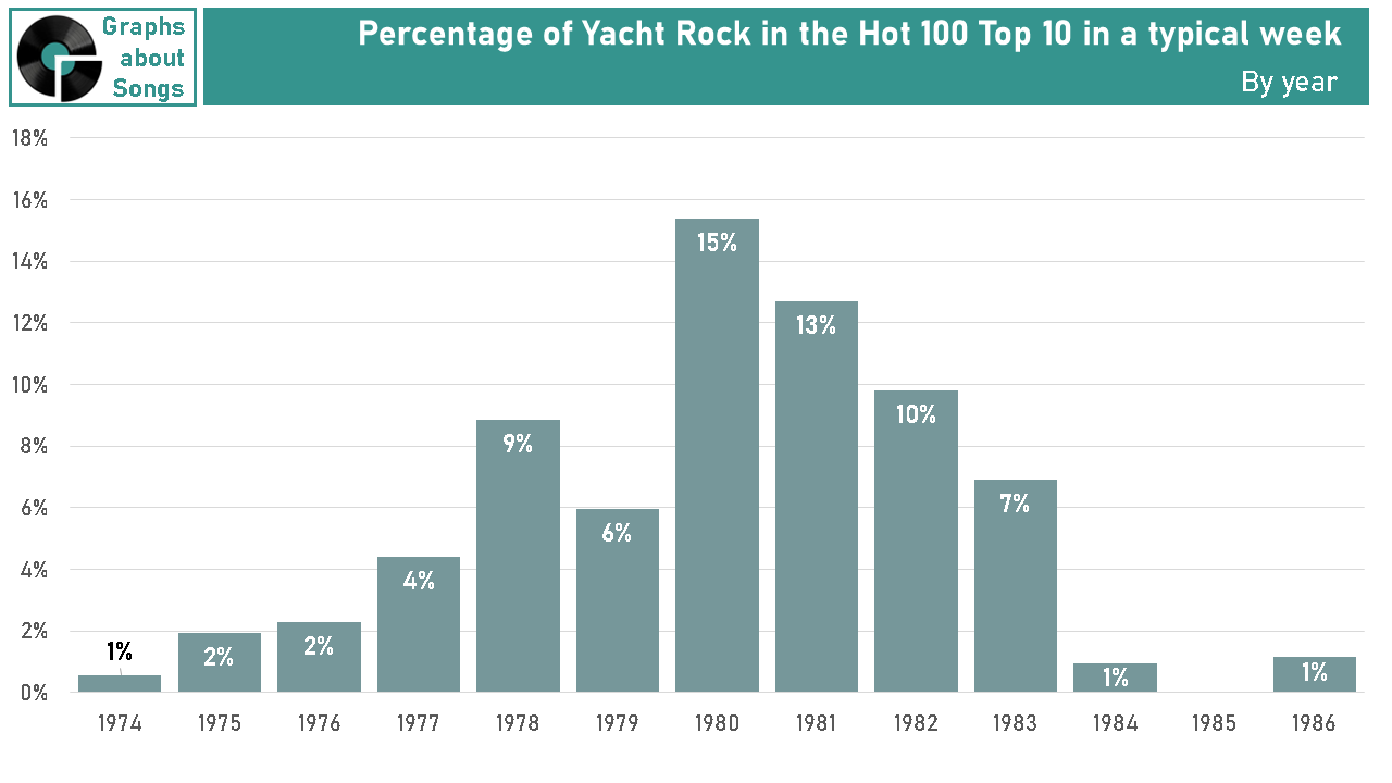 The graph below shows the percentage of Top 10 hits in a typical week each year were bona-fide Yacht.